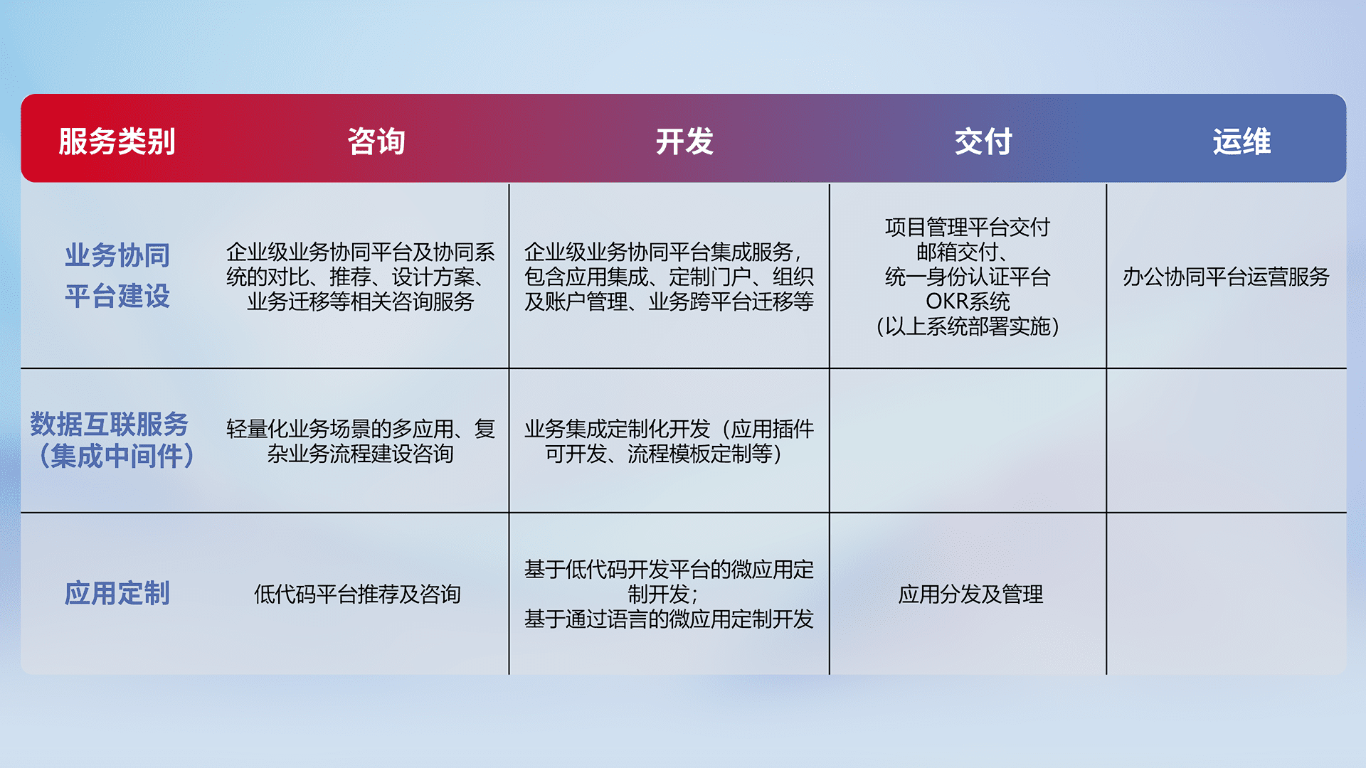 针对钉钉、、企微、、、、IDaas等平台级产品提供产品的规划、、方案、、交付、、、定制化开发等服务,,实现如统一协同办公、、、、智能客户服务、、、混合会议管理、、智能数据查询、、、等业务场景,,实现数字化转型。。。