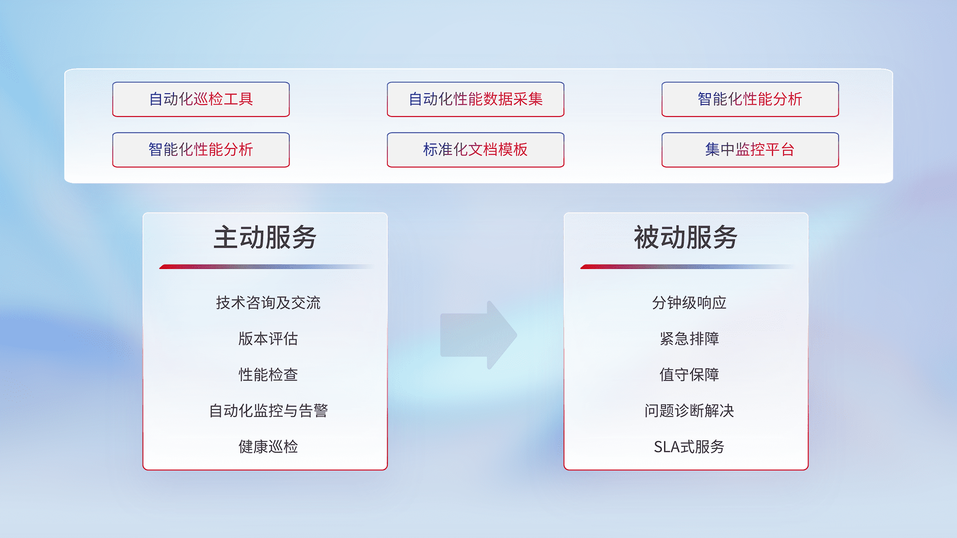 智能化工具和标准化文档,,,,保障服务质量,,,提供主动服务(包含技术咨询、、、、版本评估、、性能检查、、、自动化监控与告警、、、、健康巡检)和被动服务包含(分钟级响应、、、紧急排障、、值守保障、、、、问题诊断解决、、、SLA服务)。。。